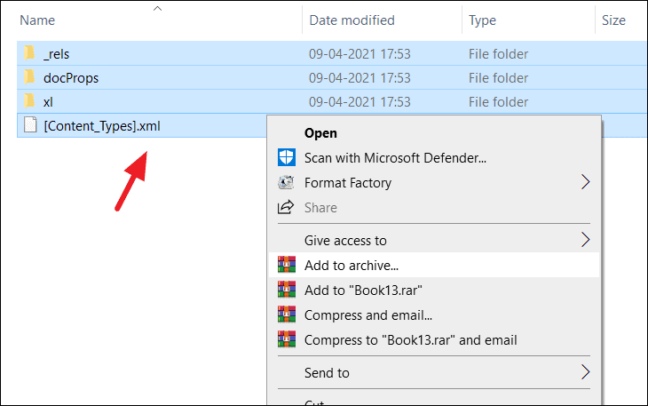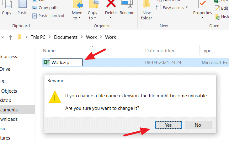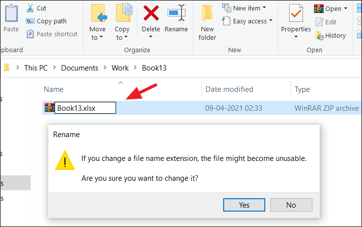 Step 9: Rename the zip file, changing the extension back to .xlsx. Confirm the change if prompted.