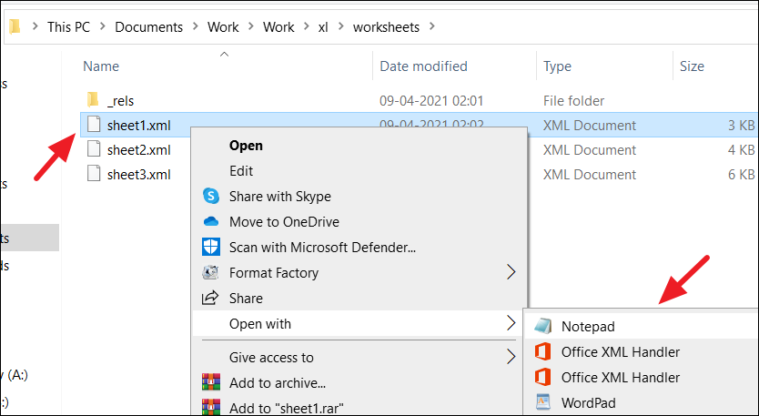 Step 6: Identify the XML file corresponding to the protected sheet. Right-click on this file, hover over Open with, and select Notepad.