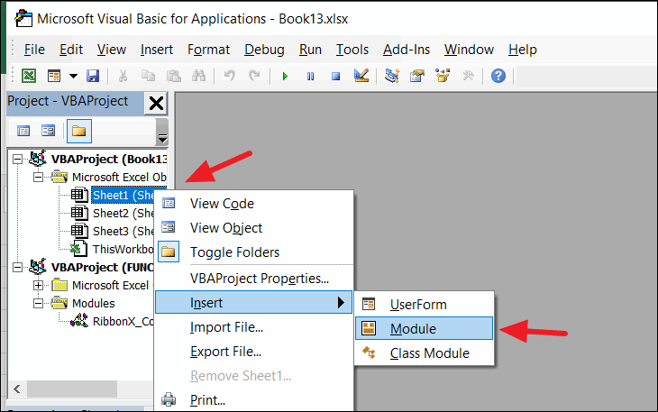 Step 3: In the VBA editor, locate the left pane labeled Project-VBAProject. Expand the Microsoft Excel Objects folder, right-click on the protected sheet, select Insert, and then choose Module.