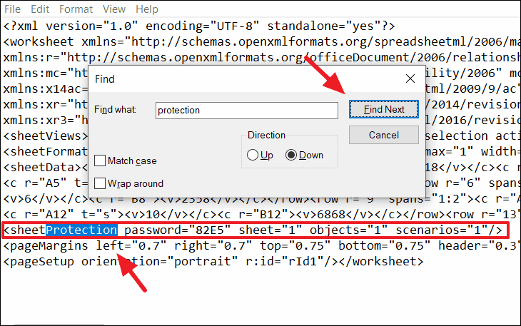 Step 7: In Notepad, press CTRL + F to open the Find dialog box. Search for the tag <sheetProtection. Delete this entire tag from the XML file.