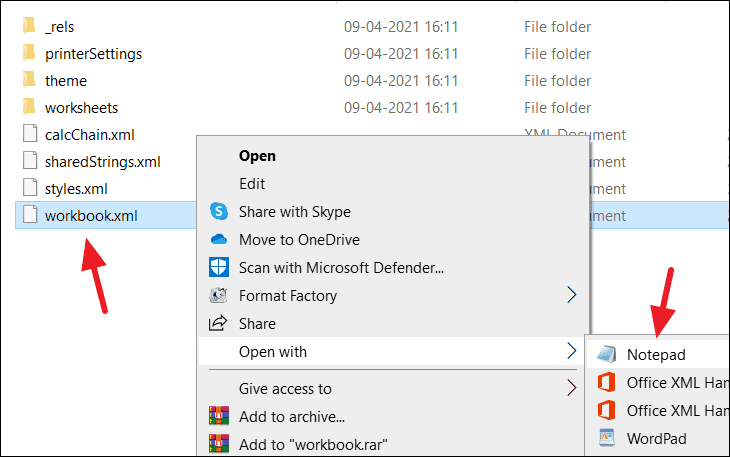 Step 5: Right-click on workbook.xml and select Open with > Notepad.
