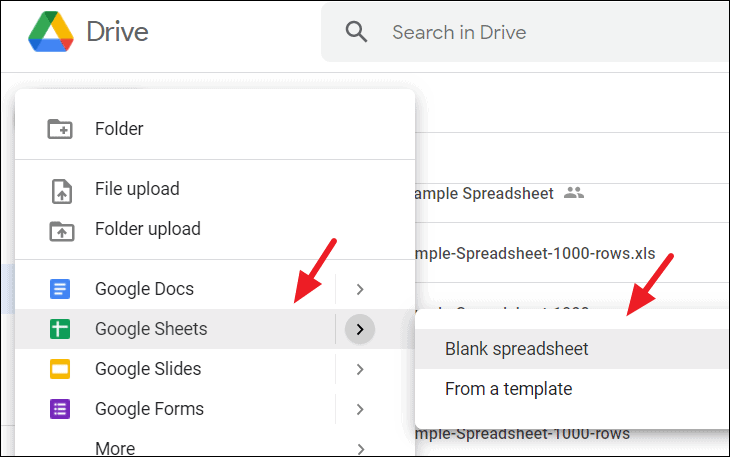 Step 2: From the dropdown menu, hover over Google Sheets and select Blank spreadsheet.