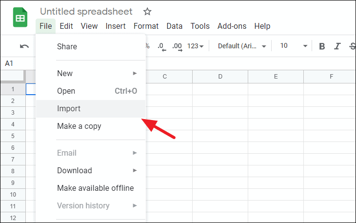Step 3: In the new spreadsheet, click on File in the toolbar and choose Import from the dropdown menu.