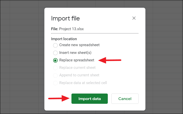 Step 6: When prompted, choose the Replace spreadsheet option and click on Import data.