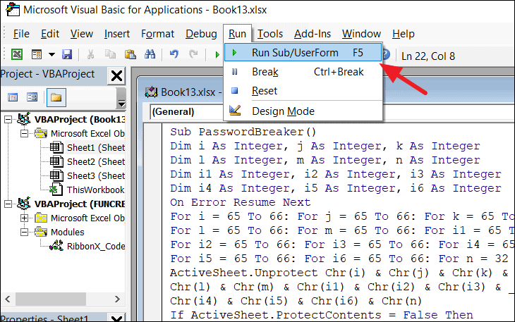 Step 5: Press F5 or click on the Run button in the toolbar to execute the code. The macro will attempt to unprotect the sheet. This process may take some time depending on your system.