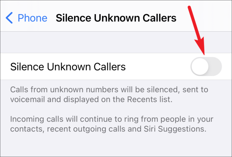 Then scroll down and make sure that it says off next to ‘Silence Unknown Callers’. If it says on, tap it to open it.
