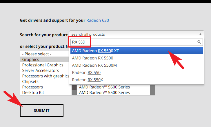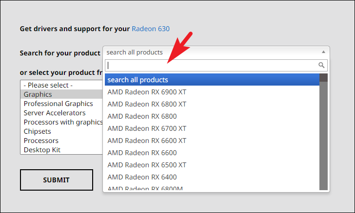 Step 2: In the "Search for your product" field, type the name of your AMD product to search for it. Alternatively, you can use the dropdown menus to manually select your product category, series, and model.