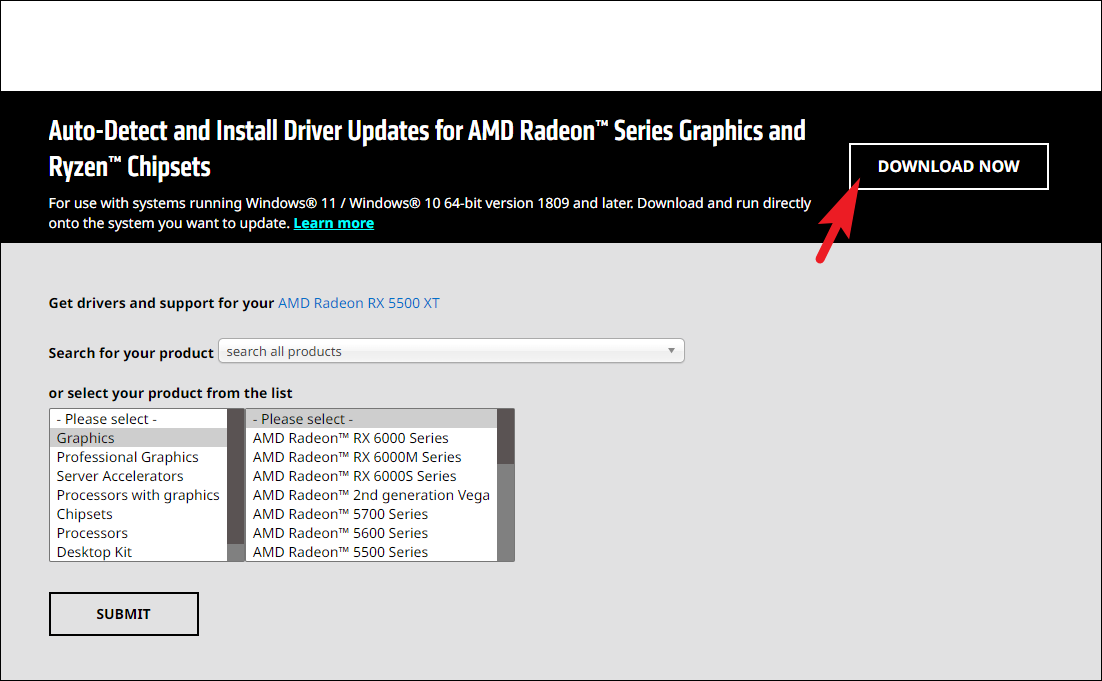 Step 3: Once you've selected your product, click on the "Submit" button to proceed to the driver download page.