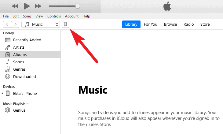Next, click on the ‘device’ icon present at the top right section of the iTunes window.