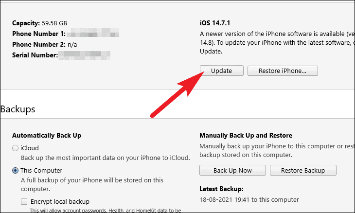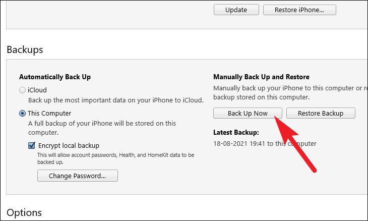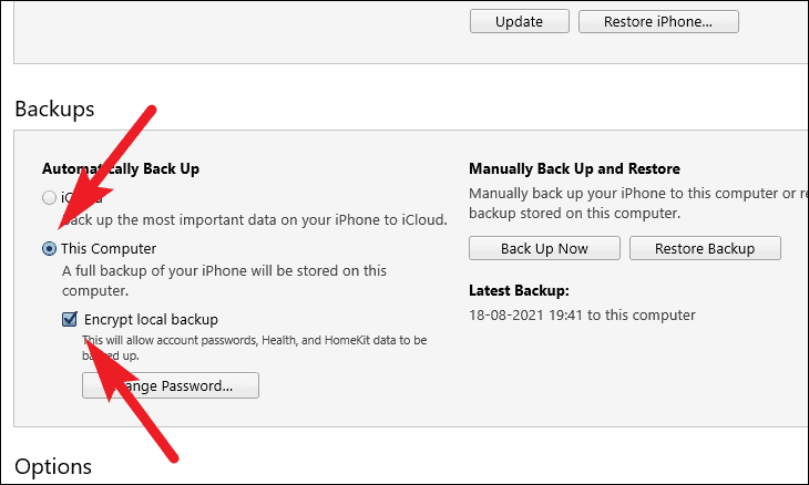 Now, from the ‘Summary’ page, locate the ‘Backup’ section and click on the radio button preceding the ‘This computer’ option to create a local backup of your device. Next, also click on the checkbox preceding the ‘Encrypt iPhone backup’ this allows for backing up of sensitive data and archives the backup so no subsequent backup will overwrite it. An archived backup can be really helpful in case you wish to roll back to the previous version of iOS.