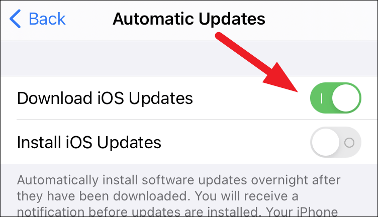 Next, toggle the switch to the ‘On’ position following the ‘Download iOS Updates’ to enable automatic download for the upcoming updates.