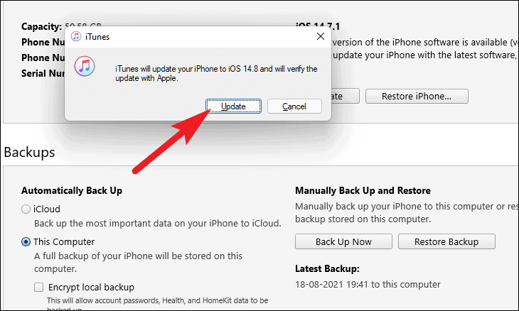 Once the download has been completed. Click on the ‘Update’ button again to start installing the update on your iPhone. This will bring up a pop-up pane on your screen.