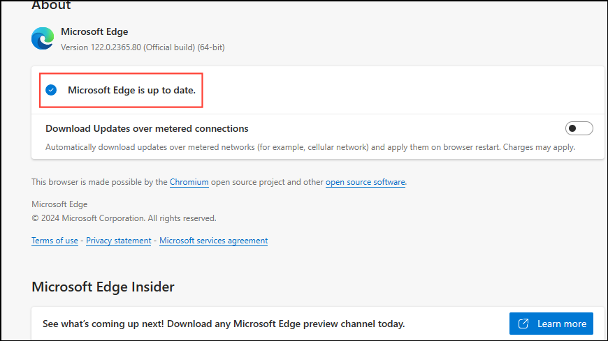 - Now, when the browser reopens, go to the 'About Microsoft Edge' option, and it will show you that the browser is up to date.