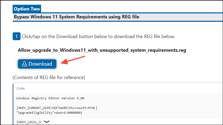 - Scroll down to the 'Option Two' section and click on the 'Download' button for the 'Allow_upgrade_to_Windows11_with_unsupported_system_requirements.reg' file.