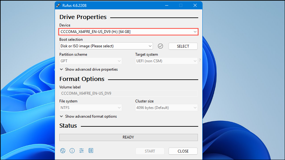 - Connect a USB drive to your computer with at least 16 GB of free space and it will show up in Rufus in the dropdown menu at the top.