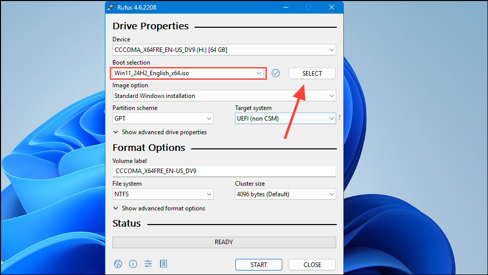- Now click on the 'Select' button on the right and navigate to where you've downloaded the Windows 11 24H2 ISO. Click on it to select it and it will appear in the 'Boot selection' dropdown.