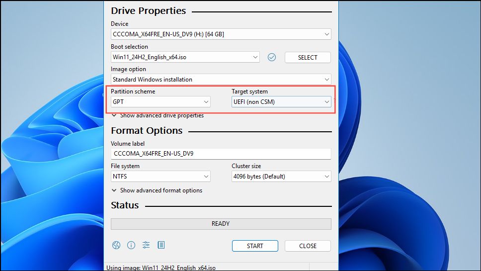 - Make sure the 'Partition scheme' and 'Target system' options match those of your system. You can change them by clicking on the dropdown menu for each option.