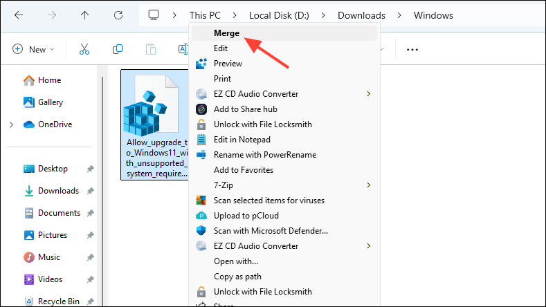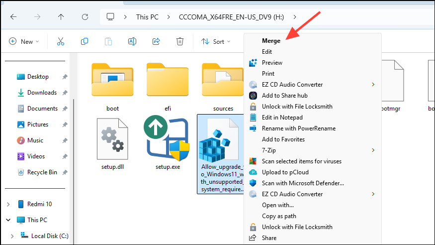 - Once the ISO is mounted, right-click on the .reg file and click on 'Merge'. Then click on the 'Yes' button in the User Account Control pop-up.
