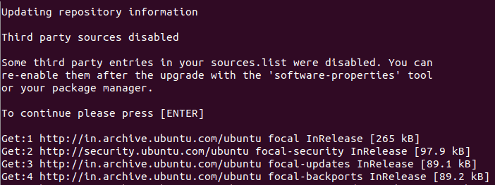 do-release-upgradeStep 3: If you have any third-party repositories added to your sources.list file (the list of repositories for installing or updating software), the upgrade tool will notify you. Press Enter to proceed. You can re-enable these repositories after the upgrade is complete.