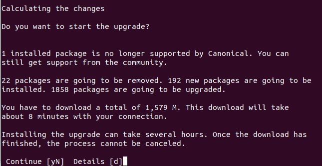 Step 4: After some initial checks, the upgrade tool will display a summary of the changes that will occur. You'll be prompted to confirm the upgrade. Press Y and then Enter to proceed. If you'd like to see more detailed information, press d to view the list of packages that will be affected.
