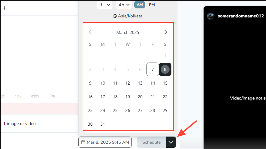 Step 4: Choose the date and time you want the Story to go live, then click "Save and schedule." Metricool will automatically publish your Story at the specified time.