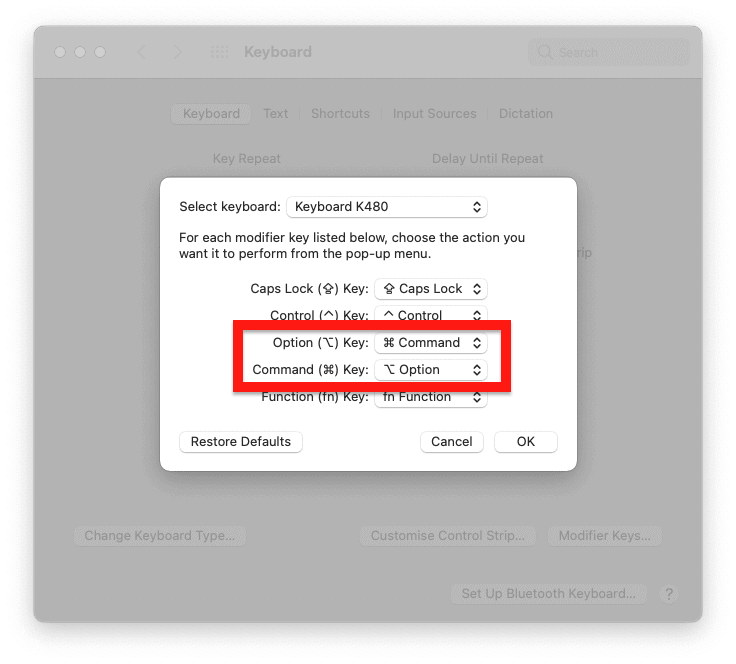 Swap/remap the modifier keys for ‘Option’ and ‘Command’ keys so it matches the new (Mac-like) layout of the keyboard.