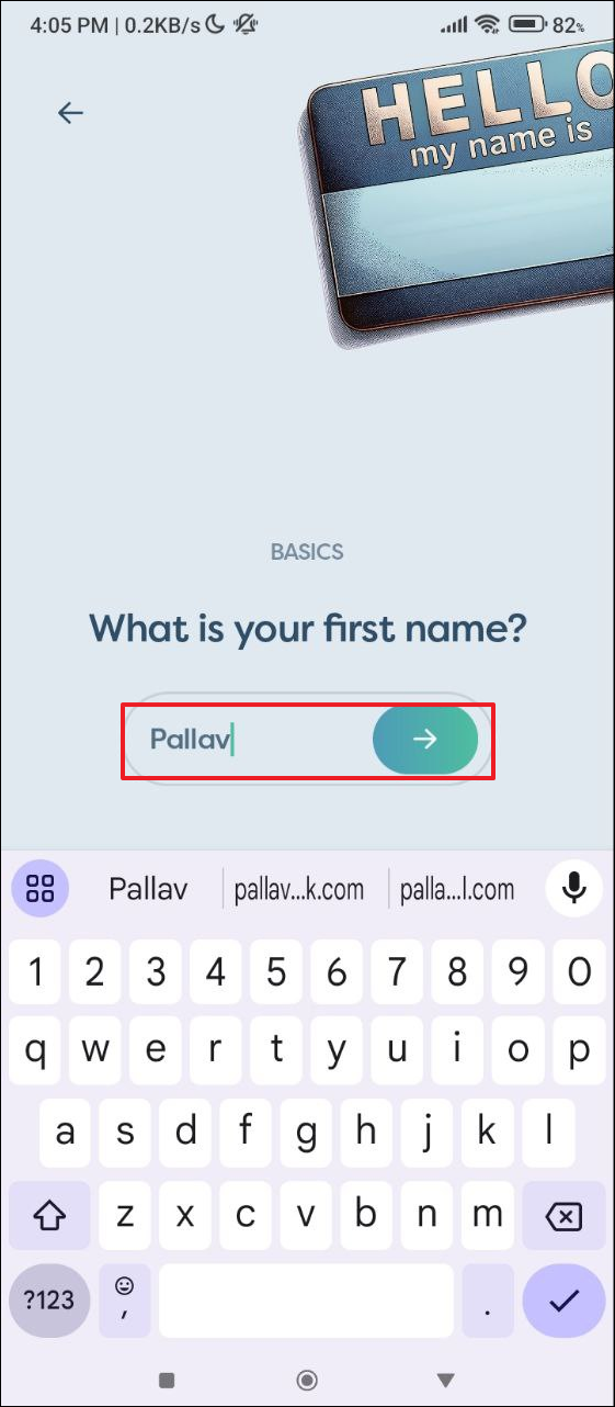 - Enter your name in the text field on the next page and tap on the arrow button.
