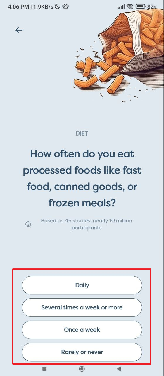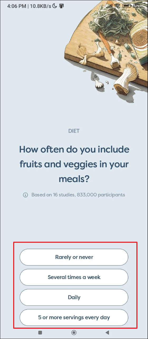 - Now, you will need to answer questions regarding your diet by tapping on an answer from a given list of options.