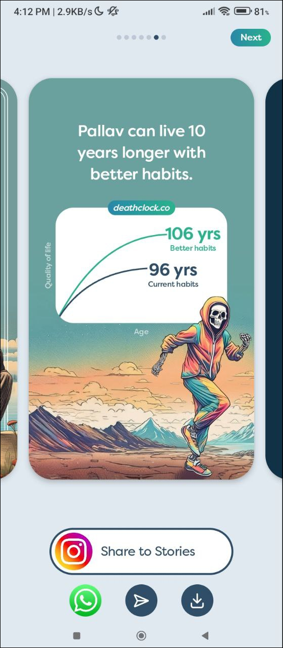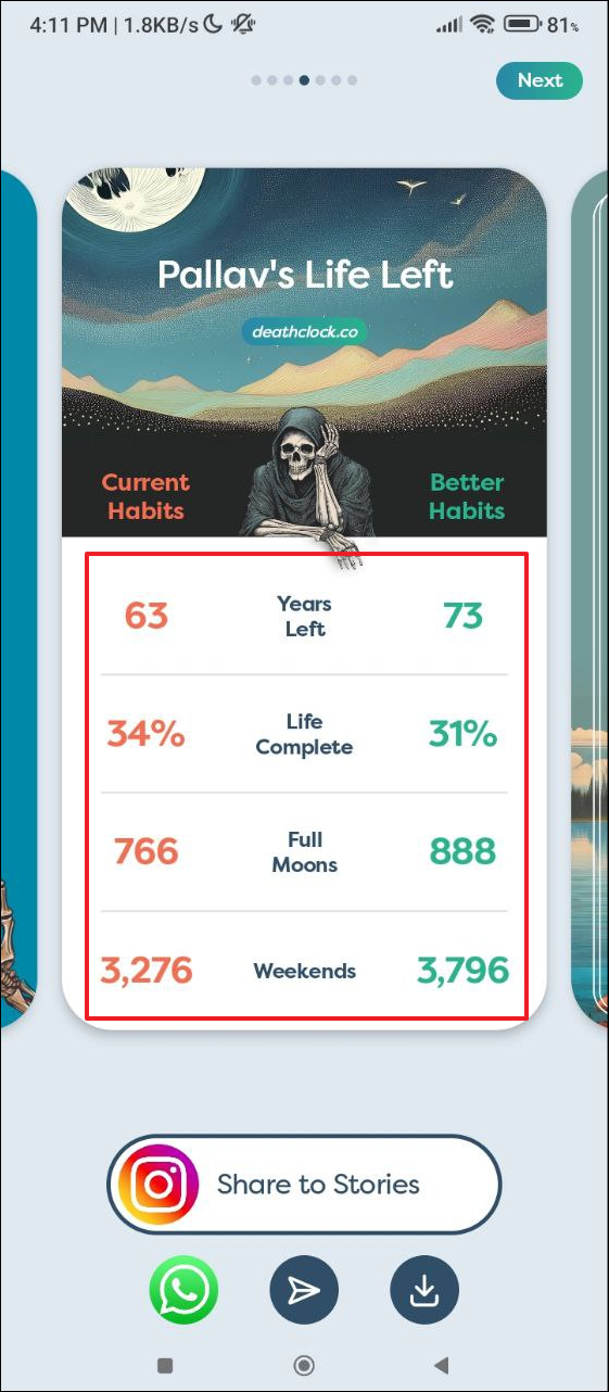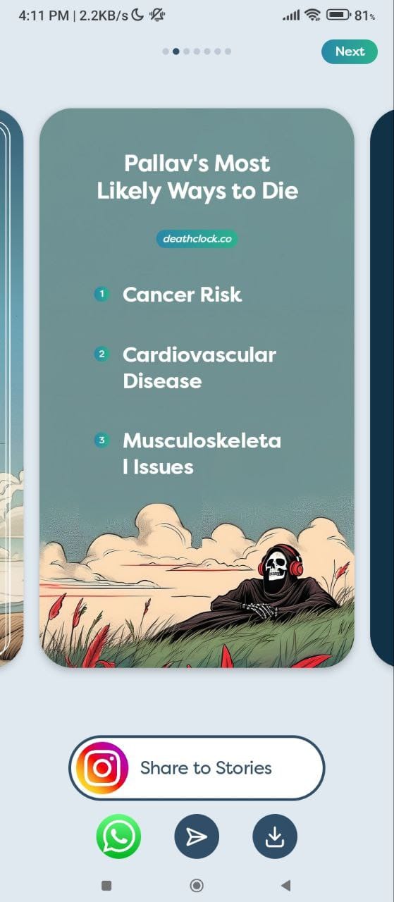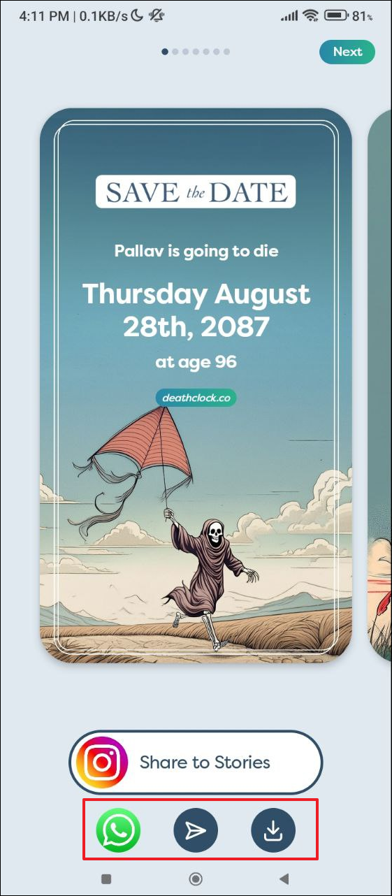 - Finally, the app will show you your death date in the form of a death-day card. You can share it with others or download it to your device using the options at the bottom.