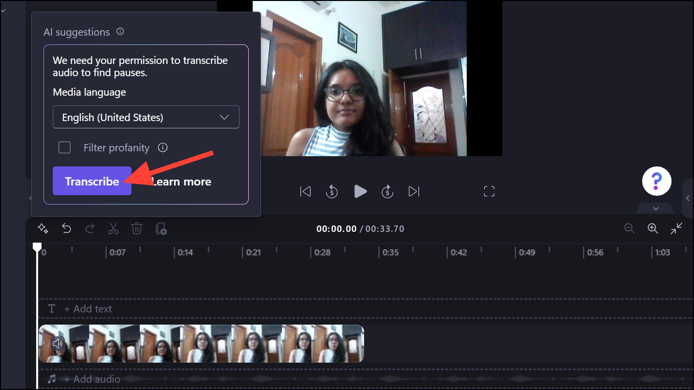 - Clipchamp will ask for your permission to transcribe the audio. Click on the 'Transcribe' button to proceed.