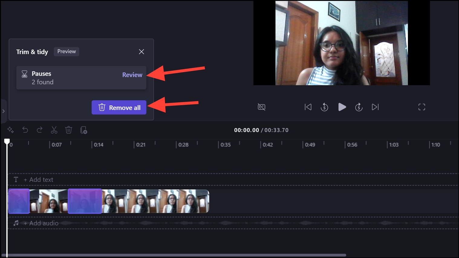 - Once it's complete, it'll list the number of pauses it found and highlight them on the timeline. You can either click on 'Remove all' to delete the silences right away. Alternatively, click on 'Review' to manually review the pauses found by the AI.