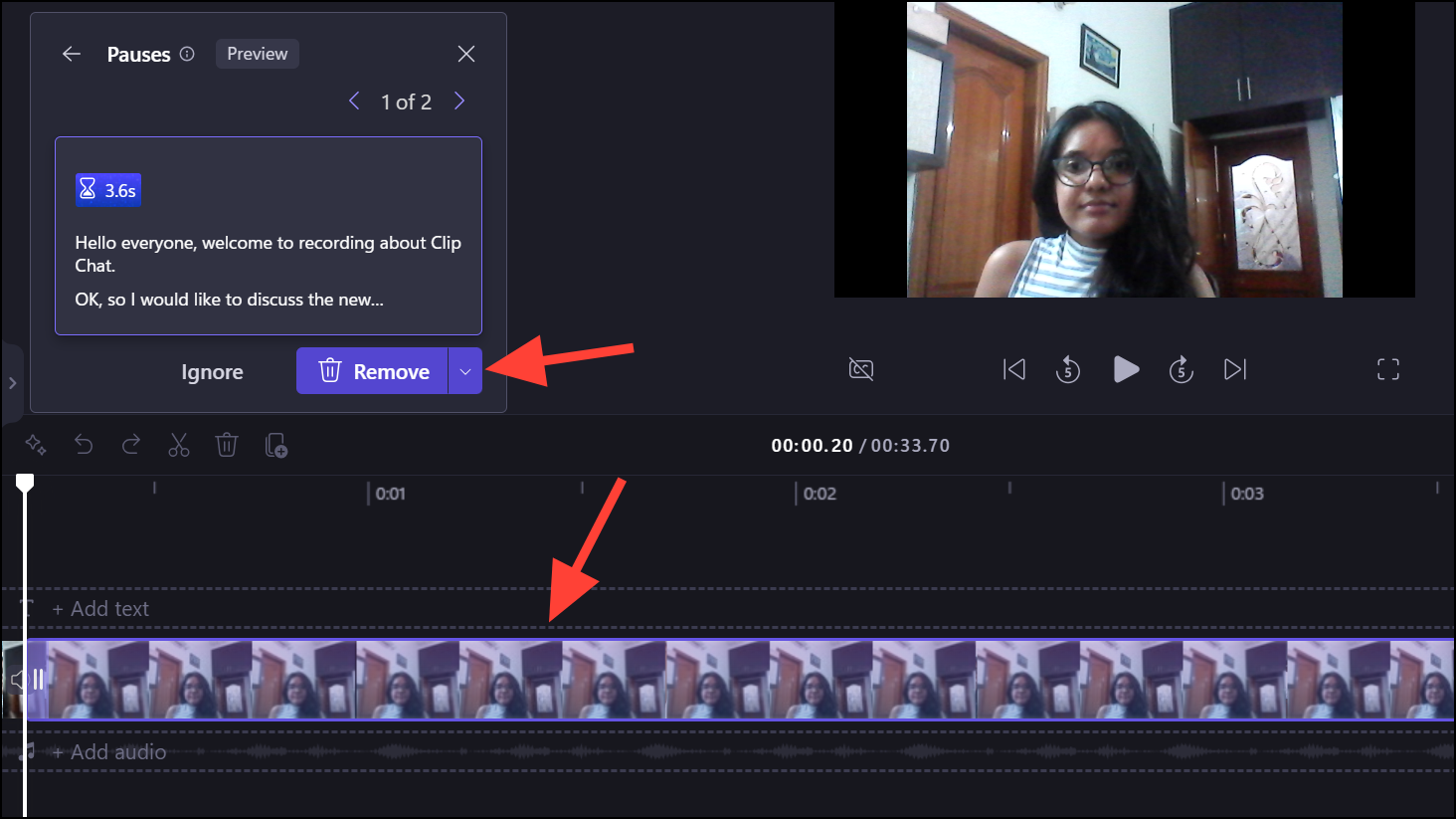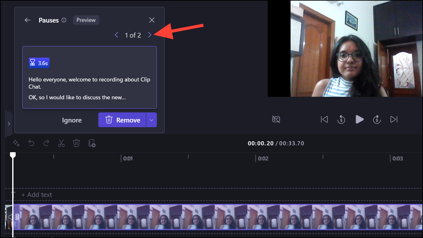 - It'll show the timestamp for the pause found by the AI and also expand it on the timeline for proper reviewing. You can listen to it and then click on 'Remove' to delete it, choose to ignore it altogether, or manually trim it.