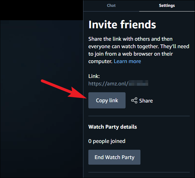 A watch party link will appear on your screen. Share it with others, and they can use it to join your party. You can watch the title in sync with everyone involved and also chat at the same time.