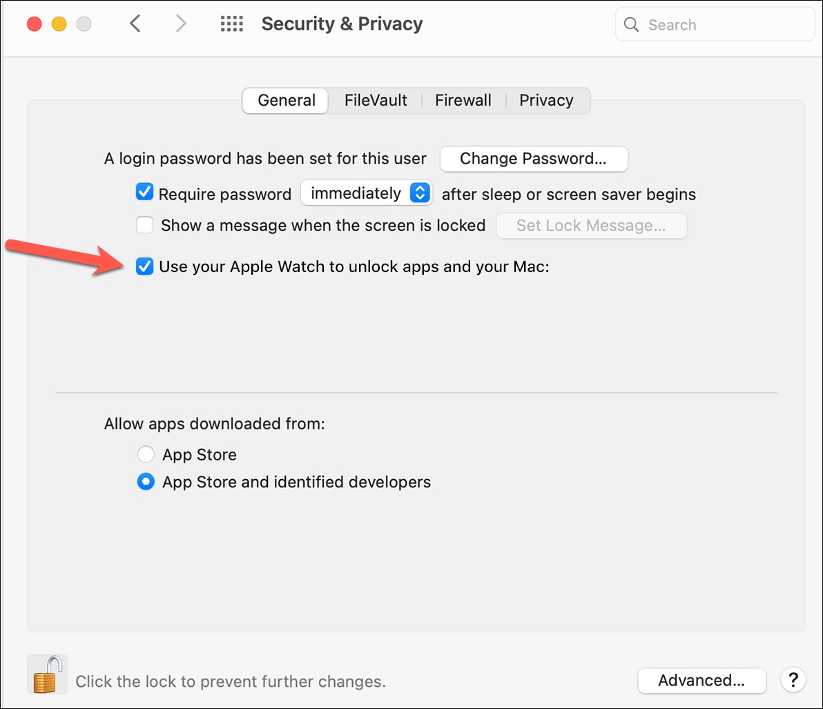 For macOS Monterey or earlier, go to the Apple logo > System Preferences. Click the option for ‘Security & Privacy’. Then, click the option for ‘General’. Then, select the checkbox preceding ‘Use your Apple Watch to unlock apps and your Mac’ or ‘Allow your Apple Watch to unlock your Mac’, depending on which option is present on your system.