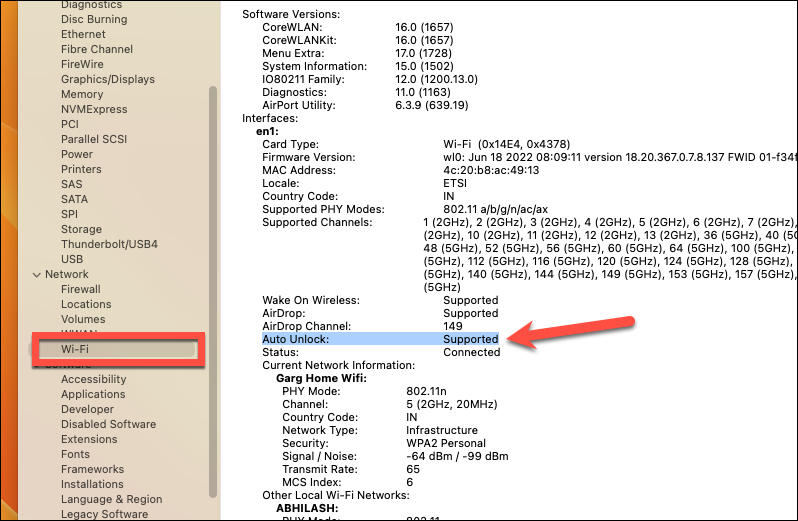 If you’re still unsure whether your Mac supports the feature, press the Option button on your keyboard and click the ‘Apple logo’ while pressing it. Then, click ‘System Information’ from the menu. From the window that opens, go to ‘Wi-Fi’ from the left sidebar and find the ‘Auto-Unlock’ feature on the right. It should say ‘Supported’, if not, it’s time to abandon the whole endeavor.