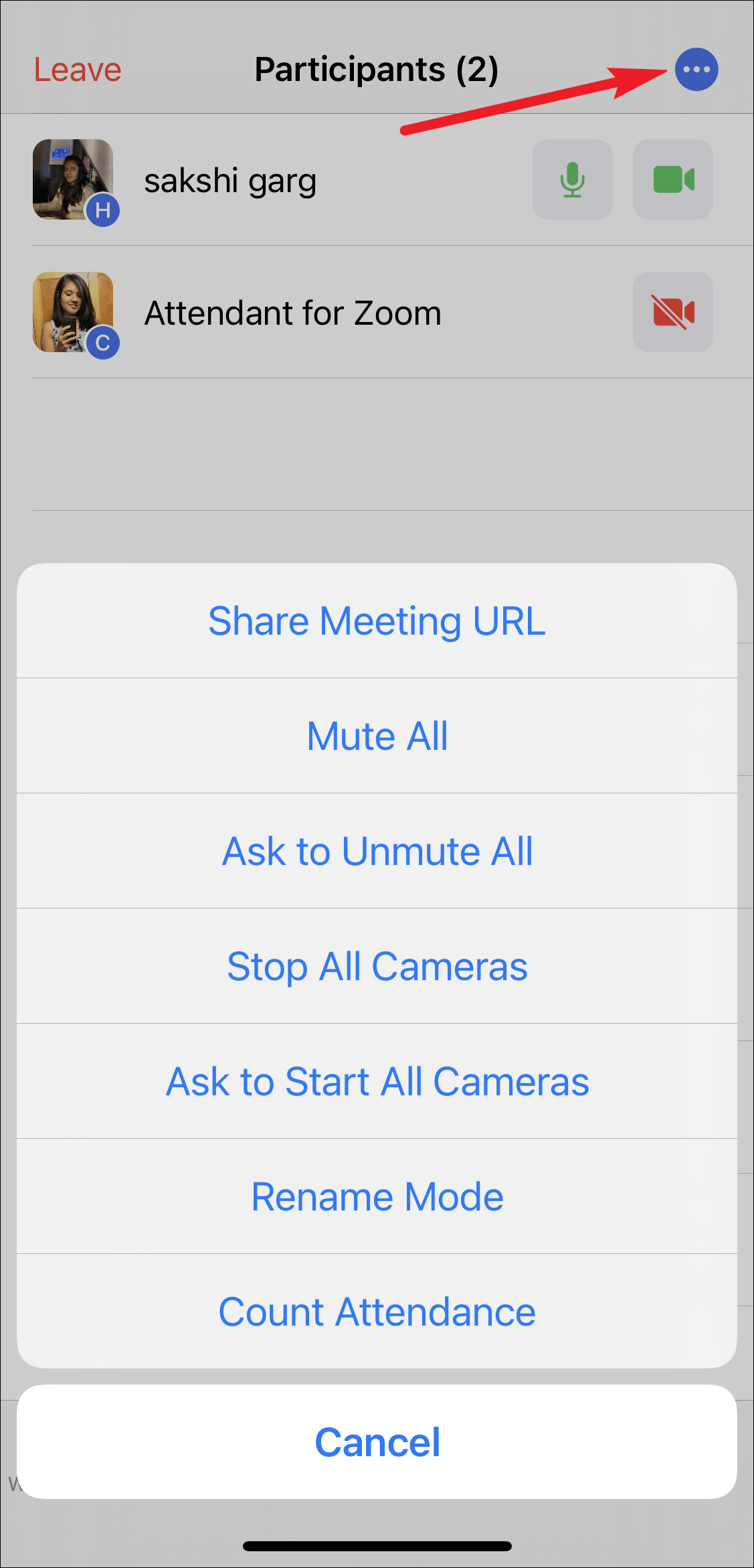 To view the options like mute all, count attendance, etc. that work for all participants, go to the ‘Participants’ tab, and tap the ‘More Options’ icon (three-dot menu) on the upper right corner of the screen. The options menu will appear on your screen; tap the one you want to use.