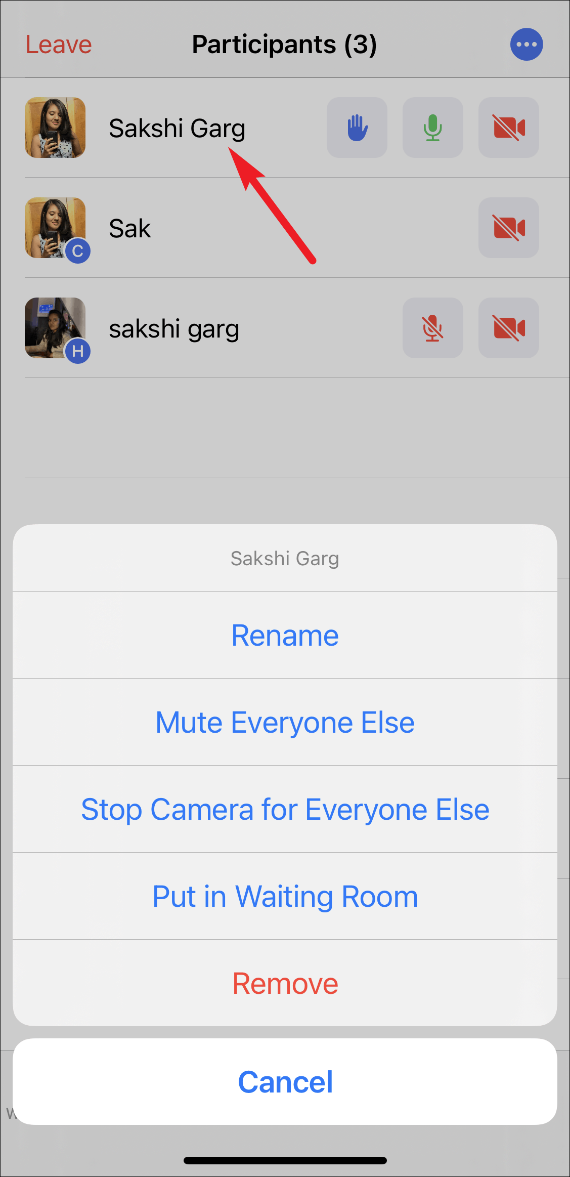 To view the participant-specific options like Rename, Remove, Mute everyone else except them, etc., go to the ‘Participants’ tab, and tap the name of the participant you want these options for. The options menu will pop up on the screen with all the available options.