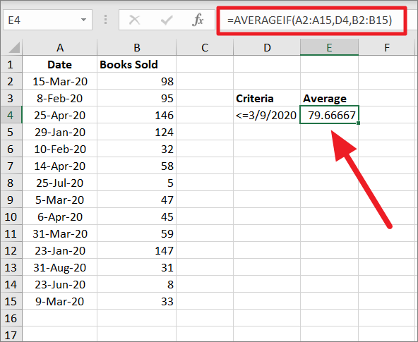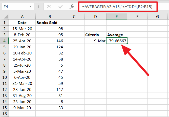 =AVERAGEIF(A2:A15,D4,B2:B15)To specify the date condition ‘on or before March 9’, here, we are using <=March 9 (less than or equal to March 9) which is entered in the cell D4 and that cell reference is used as criteria instead. The formula looks up the range A2:A15 for the date March 9 or before March 9. If the condition is met, the formula evaluates the average for corresponding values in B2:B15.