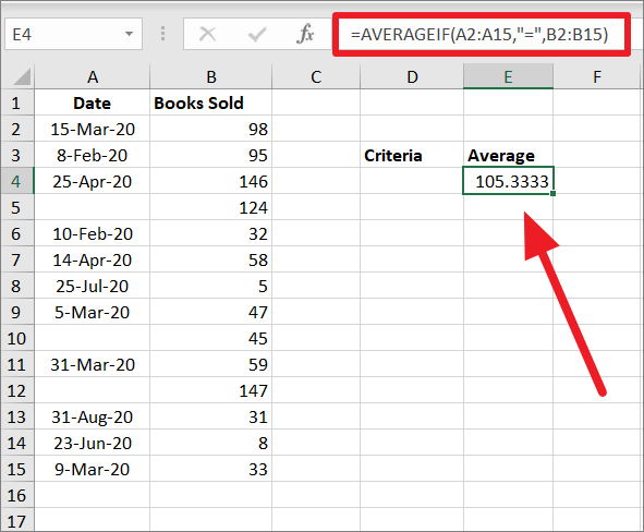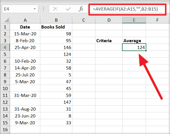 As you can see, cells A5, A10, and A12 are blanks, so the formula takes 124, 45, and 147 from column B corresponding to those cells and evaluates the average for those values. The result is returned in cell E4.
