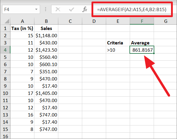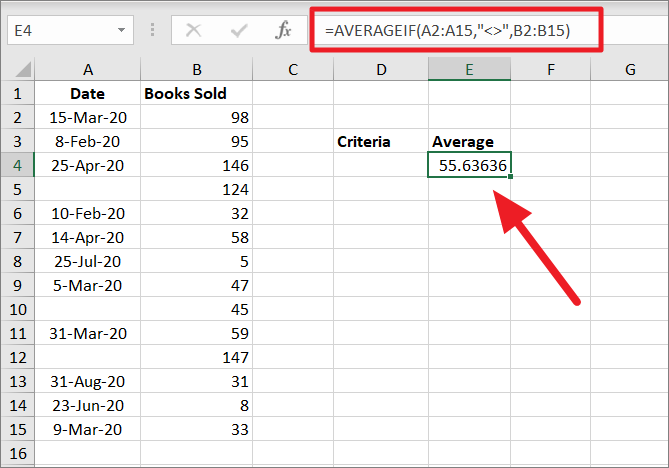 =AVERAGEIF(A2:A15,"<="&D4,B2:B15)Here, we are conjoining the logical operator with the cell reference using the ‘&’ operator. The text, logical operators, and date must be enclosed in double quotation marks in the criteria argument.