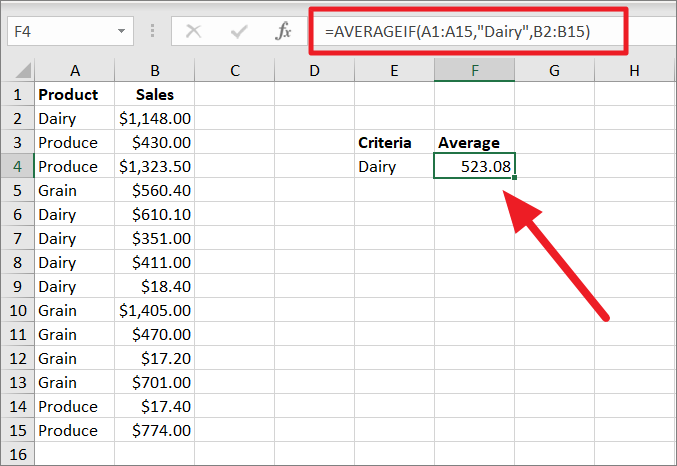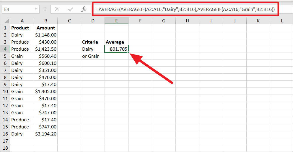 =AVERAGE(AVERAGEIF(A2:A16,"Dairy",B2:B16),AVERAGEIF(A2:A16,"Grain",B2:B16))The above formula includes two AVERAGEIF functions – one for finding the average of ‘Dairy’ sales and another for finding the average of ‘Grain’. The first AVERAGEIF function averages the cells in B1:B16 when values in A1:A16 equal to Dairy and the second AVERAGEIF function average cells in B1:B16 when values in A1:A16 equal to Grain. Then, we average both results by nesting both AVERAGEIF functions within the AVERAGE function.