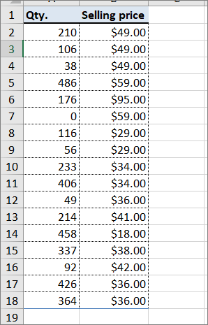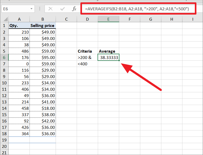 =AVERAGEIFS(B2:B18, A2:A18, ">200", A2:A18,"<500")Here, we specified the start and endpoints of the range (Quantity) that we want to find the average for. With both criteria, the formula checks each cell in column A whether it is greater than 200 and less than 400. If both conditions are true, it takes out the corresponding selling price from column B. Then, it will calculate the average for all those numbers that satisfy both criteria.