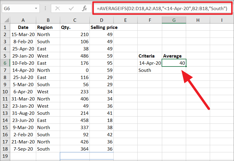 =AVERAGEIFS(D2:D18,A2:A18,"<14-Apr-20",B2:B18,"South")In the formula, average_range is specified as column D, criteria_range1 is column A, criteria1 is ‘<14-Apr-20’, criteria_range2 is column B, and criteria2 is ‘South’.