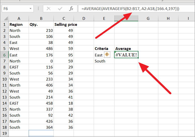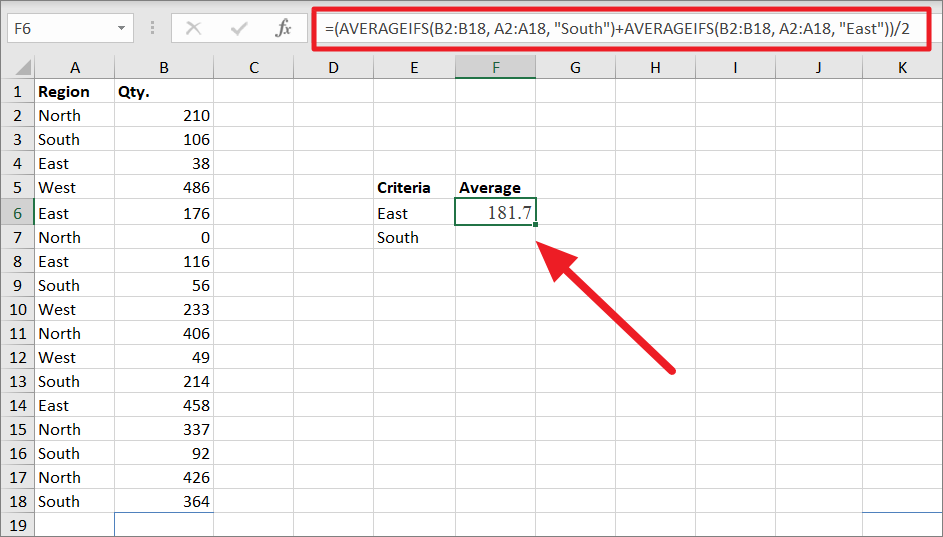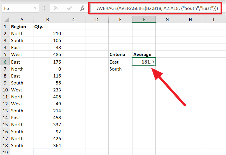 =AVERAGE(AVERAGEIFS(B2:B18, A2:A18, {"South","East"}))In the previous example, we had to manually tell Excel to add two different AVERAGEIFS together and divide the result by 2. Here, Excel automatically finds the average for East and South by enclosing criteria inside an array as shown below. Also, this formula can significantly reduce the size of the formula no matter how many criteria you have to include.