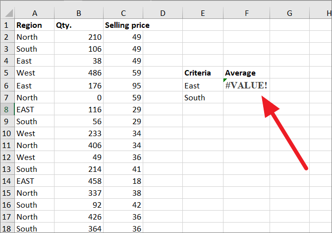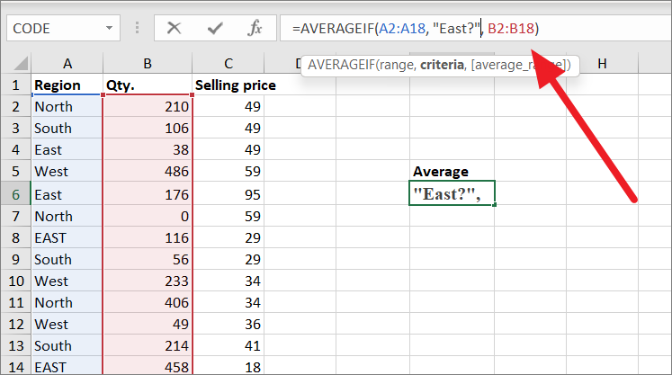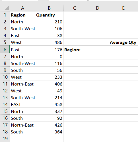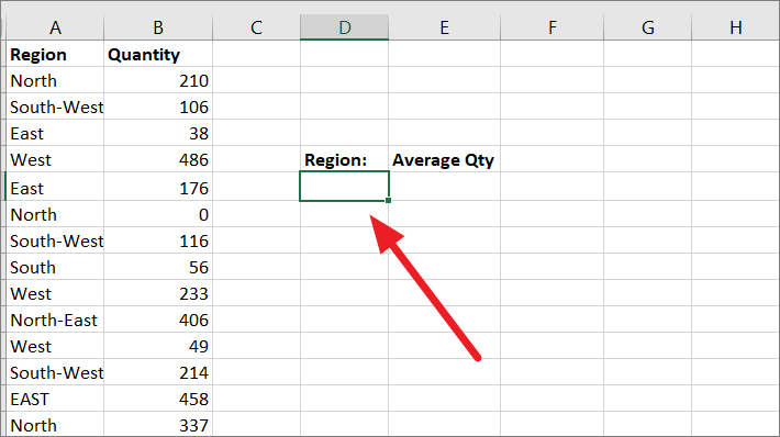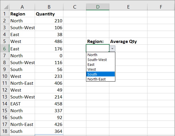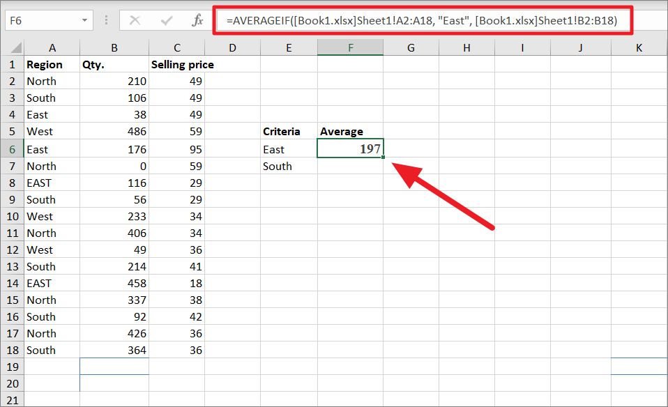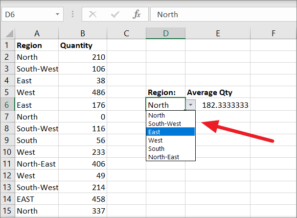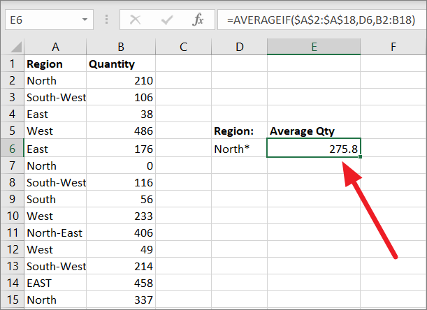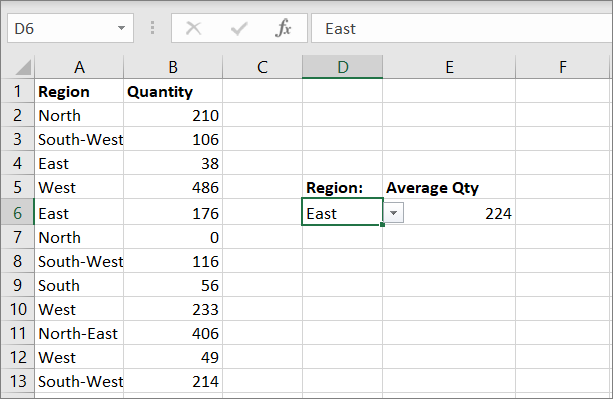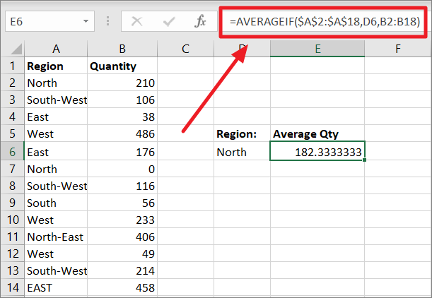 =AVERAGEIF($A$2:$A$18,D6,B2:B18)Here, we made the range argument absolute by adding dollar symbols ($A$2:$A$18), so it doesn’t change when the criterion is adjusted. The formula calculates the average quantity in the range B2:B18 if the selected criteria (Region) in D6 are met.