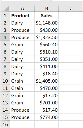 =AVERAGEIF(A1:A14,"Dairy",B2:B15)The formula calculates the average for values in B2:B15 if the corresponding cells in the range A1:A15 has the exact value ‘Dairy’ (criteria).