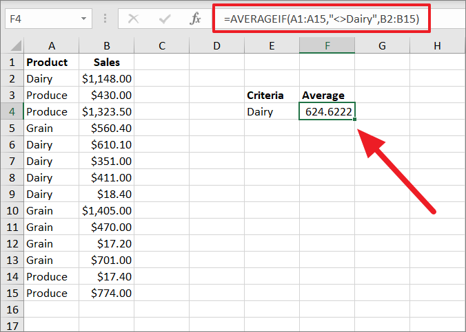 =AVERAGEIF(A1:A15,"<>Dairy",B2:B15)The formula calculates the average of values in B2:B15 if the corresponding cells in the range A1:A15 are not ‘Dairy’ (<>Dairy).