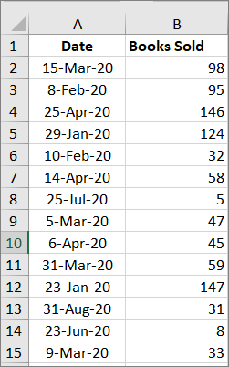 When working with the AVERAGEIF function, you can also use a date as criteria, similar to the numerical and text criteria. Let’s take a look at this table which contains the number of books sold on different dates.