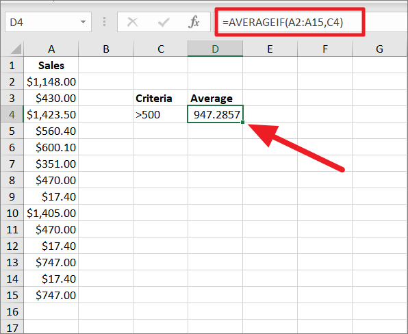 =AVERAGEIF(A2:A15,">500")Since the range and average_range are the same in this sample data set, we omitted the last argument, but the formula automatically assumes A2:A15 as the average_range and calculates the average for values that are greater than 500 (>500).