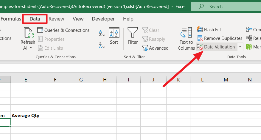Then, go to the ‘Data’ tab and click the ‘Data Validation’ button from the ribbon.